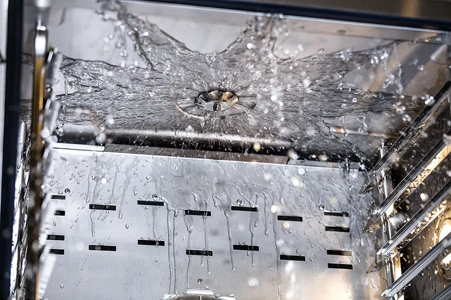 Zintegrowany wymiennik ciepła wykorzystuje temperaturę odprowadzanej pary i znacznie ogranicza zapotrzebowanie na energię elektryczną.