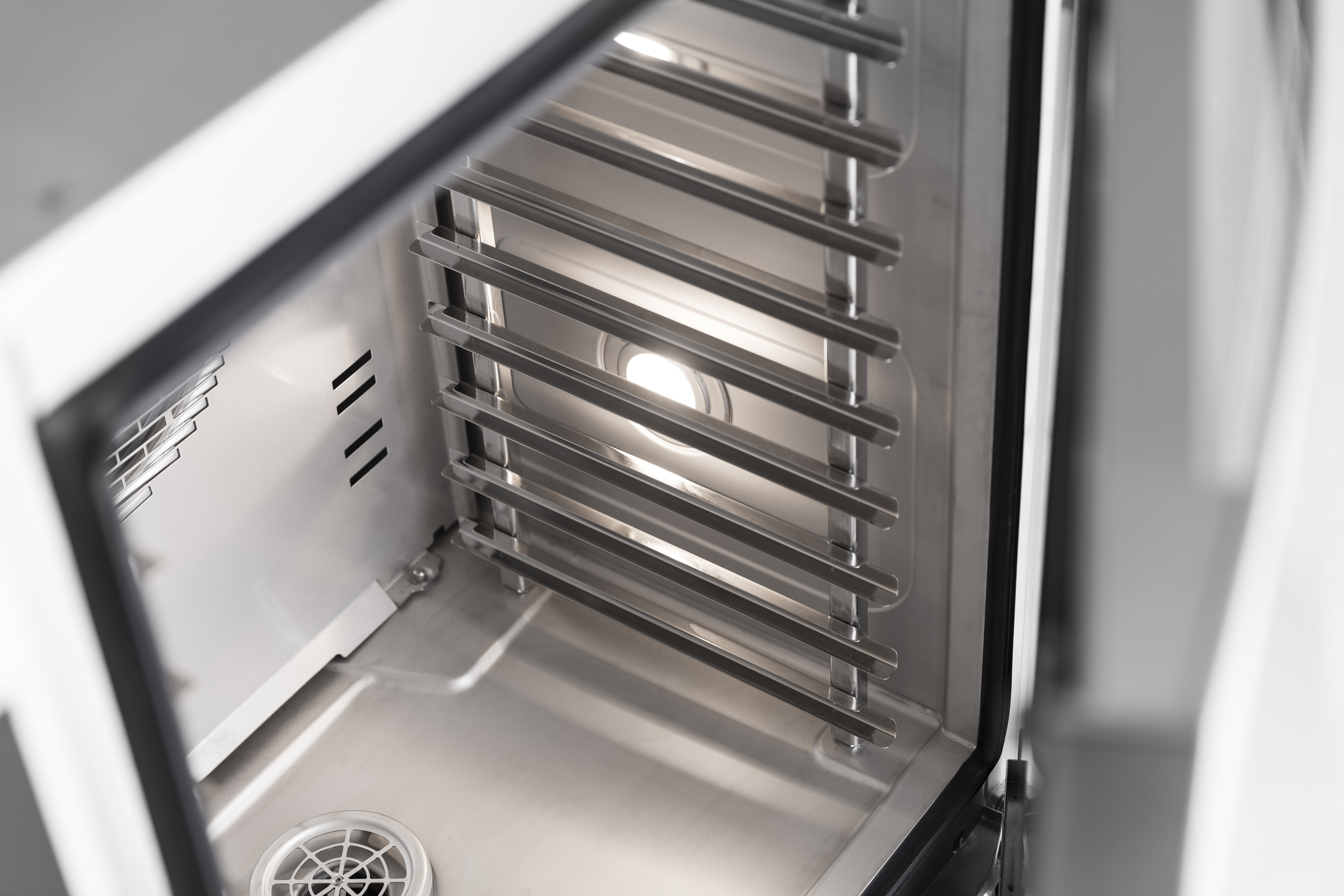 Poprzeczny układ prowadnic gwarantuje bezpieczeństwo podczas wyjmowania i wkładania pojemników gastronomicznych GN oraz pełną kontrolę procesu gotowania na poszczególnych poziomach. Mniejsze pojemniki gastronomiczne można umieścić na jednym poziomie umieszczając je obok siebie na nierdzewnych rusztach lub przeznaczonych do tego specjalnych adapterach.