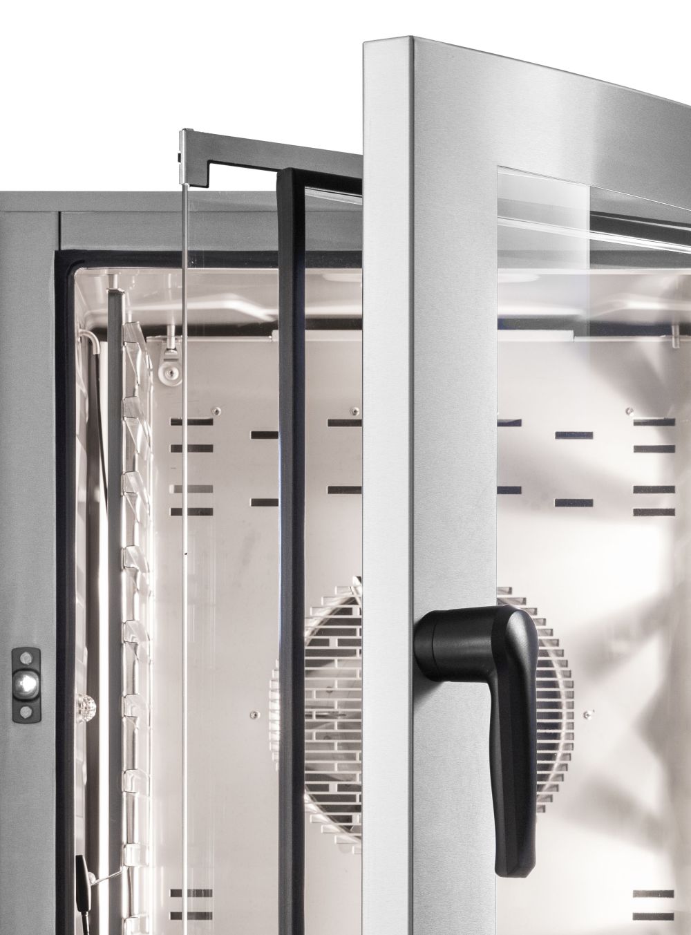 Unikalne rozwiązanie z potrójną szybą* zmniejsza temperaturę powierzchni drzwi i eliminuje ryzyko oparzenia. Hamulec wentylatora zapobiega niebezpiecznym wylotom pary przy otwieraniu pieca konwekcyjno- parowego, a w połączeniu z systemem otwierania drzwi w dwóch krokach** gwarantuje maksymalne bezpieczeństwo.