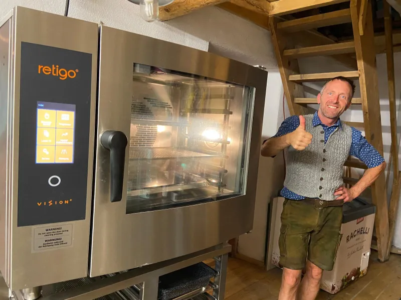 Właściciel schroniska górskiego Moaralm w Inzell, Peter Flatscher, korzysta z pieca konwekcyjno-parowego Retigo od początku sezonu 2024 i jest z niego bardzo zadowolony. To jego pierwsze doświadczenie z tym urządzeniem, które oszczędza mu mnóstwo czasu i ułatwia pracę. Używa pieca konwekcyjno-parowego głównie do przygotowywania domowych ciast i dań mięsnych, ale także podczas organizacji różnych imprez. Schronisko Moaralm jest łatwo dostępne pieszo zarówno dla turystów górskich, jak i jednodniowych wędrówek. Na terenie schroniska znajduje się plac zabaw dla dzieci. Można tu również podziwiać liczne zwierzęta domowe żyjące na halach. Okolica oferuje przyjemne, zacienione miejsca do relaksu, a po obfitym posiłku może służyć jako punkt wyjścia na piękne wędrówki. Gorąco polecamy Moaralm – zdecydowanie warto je odwiedzić.
